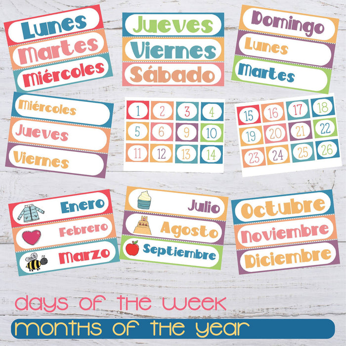 Ready to print and laminate Spanish days of the week and months of the year posters. Print, laminate and use them all year round! The set includes 40 printable posters + numbers from 1 to 31.