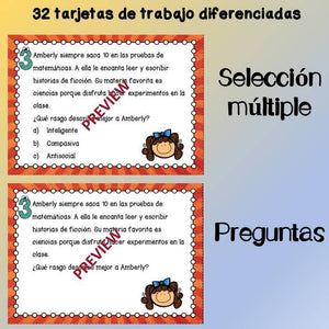 Estas tarjetas de trabajo son útiles para que tus estudiantes practiquen inferir rasgos del personaje a través de sus acciones o del dialogo. De la forma que lo utilizo en el salón de clase es como estación de lectura. Primero modelo como utilizarlas. Luego, coloco tarjetas de trabajo en las mesas y alrededor de el salón de clase. Los estudiantes pueden trabajar solos o en pareja para contestar las preguntas. Esta actividad permite que los estudiantes caminen alrededor del salón mientras practican la estrategia de inferir. También ayuda a los estudiantes que son hiperactivos a moverse en el salón de clase. Las tarjetas de trabajo también puede utilizarse como centros de lectura, o trabajo independiente. Estas tarjetas vienen diferenciadas para satisfacer las necesidades de todos tus estudiantes.