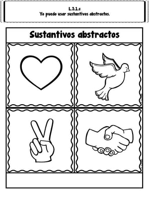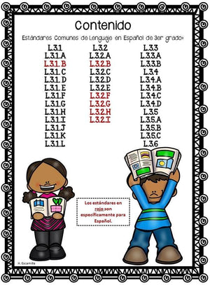 This interactive language notebook contains all of the third grade language common core standards. The standards depicted in red are specifically for Spanish. Additionally, I have added some practice pages for many of the standards to reinforce and help students better understand the language concepts and standards.I hope you and your students enjoy putting them together!Contents:-¿Cuáles son las partes de una oración?-L.3.1.a – Los sustantivos, pronombres, verbos, adjetivos y adverbios-L.3.1.b – Plurales de sustantivos regulares e irregulares-L.3.1.c – Los sustantivos abstractos-¿Qué es un verbo?-L.3.1.d – Los verbos regulares que terminan en -ar, -er, -ir y verbos irregulares-L.3.1.e – Los tiempos simples de los verbos-L.3.1.f – Concordancia entre sujeto-verbo y pronombre-antecedente-Qué es un adjetivo y adverbio?-L.3.1.g – El uso de adjetivos y adverbios-L.3.1.h – Las conjunciones coordinadas y subordinadas-¿Qué es una oración?-L.3.1.i – Oraciones simples, compuestas y complejas-L.3.1.j – Letra cursiva y bastardilla-L.3.1.k – Pronombres recíprocos (nos, os, es)-L.3.1.l – Cambio de significado de adjetivo-L.3.2.a – Las mayúsculas en títulos-L.3.2.b – Las comas en una dirección-L.3.2.c – El guión largo en dialogo-L.3.2.d – La preposición “de” -L.3.2.e – La ortografía convencional para palabras de uso frecuente, sufijos y palabras base-L.3.2.f – Los patrones de ortografía y generalizaciones -L.3.2.g – Materia de referencia-¿Qué es el acento?-L.3.2.h – El acento ortográfico-L.3.2.i – El acento diacrítico-L.3.3.a – Palabras y frases para efecto deseado-L.3.3.b – Las normativas del español oral y escrito-L.3.4.a – El contexto de la oración -L.3.4.b – El afijo-L.3.4.c – Palabra raíz-L.3.4.d – El uso del glosario y diccionarios básicos-L.3.5.a – El contexto de significado literal y no literal-L.3.5.b – Las conexiones en la vida real entre las palabras-L.3.5.c – Los matices de significado-L.3.6 – El uso de palabras y frases con precisión