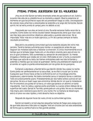 - 2.5-page fantasy story (863 words)- Las leyendas de Garlok: Fuego, fuego, ardiendo en el granero