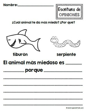 Opinion Writing in Spanish - Unit- (Escritura de opiniones en espanol)This product is in Spanish (only). This product includes over 50 pages of resources on Opinion Writing in Spanish. The level of difficulty varies. Please use your judgement as to what is appropriate for your class and students. It would work in most K,1, 2 classrooms... in Spanish immersion, bilingual, bi-literacy and Spanish language. The variety of graphic organizers, prompts, and ideas in this product will enable you to scaffold your opinion writing unit to individual students (high and low) to ensure everyone is a successful writer in the classroom. This product includes: 6- Mini- posters for classroom or lessonsOpinion Writing in Spanish- Prompts 3- Fact or Opinion Sheets Writing Prompts- Various levelsGraphic organizers- various 5- Blank graphic organizers 5- Blank writing papers 24 Writing Prompts cards and/or Opinion Question game for morning meeting5- Letter templates to persuade parents/teachers/principal to do something.___Unidad de escritura de las opiniones. Esta unidad está en español. Es apropiado para niños en Kindergarten, primero y segundo. Hay más que 50 hojas de varios niveles. Este producto incluye: -6 Mini-Carteles / Posters-Organizadores gráficos-Páginas de hecho u opinión- -Páginas de escritura -Páginas y organizadores en blanco-juego de opiniones (o más ideas para la escritura)- donde niños contesten explicando su opinión-5 cartas de convecer a los padres, profes o directores (varios temas)Esta unidad de escritura de las opiniones es para niños en cursos en español, inmersión en español o clases bilingües.